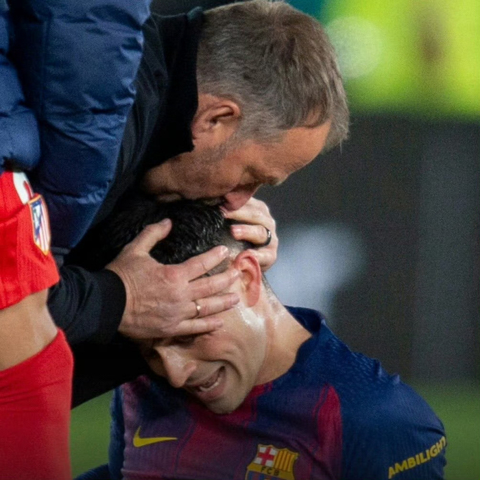 终场哨响后,佩德里直接累倒在草坪上。弗里克立刻冲进场地,安慰失落的佩德里,并在他的额头送上了一个温暖的亲吻。#足球#