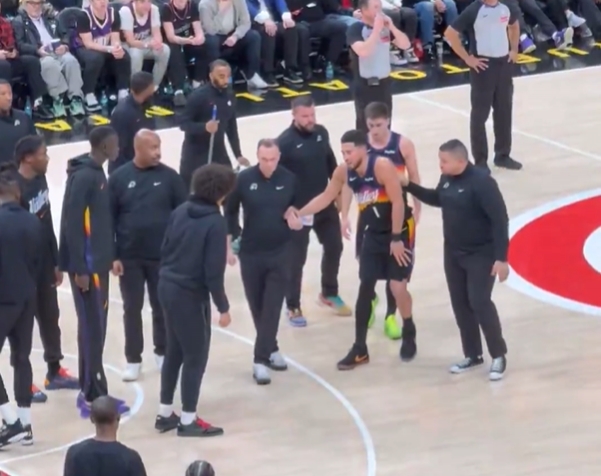 一场伤俩!布克右脚踝严重扭伤 被队友搀扶回了更衣室!